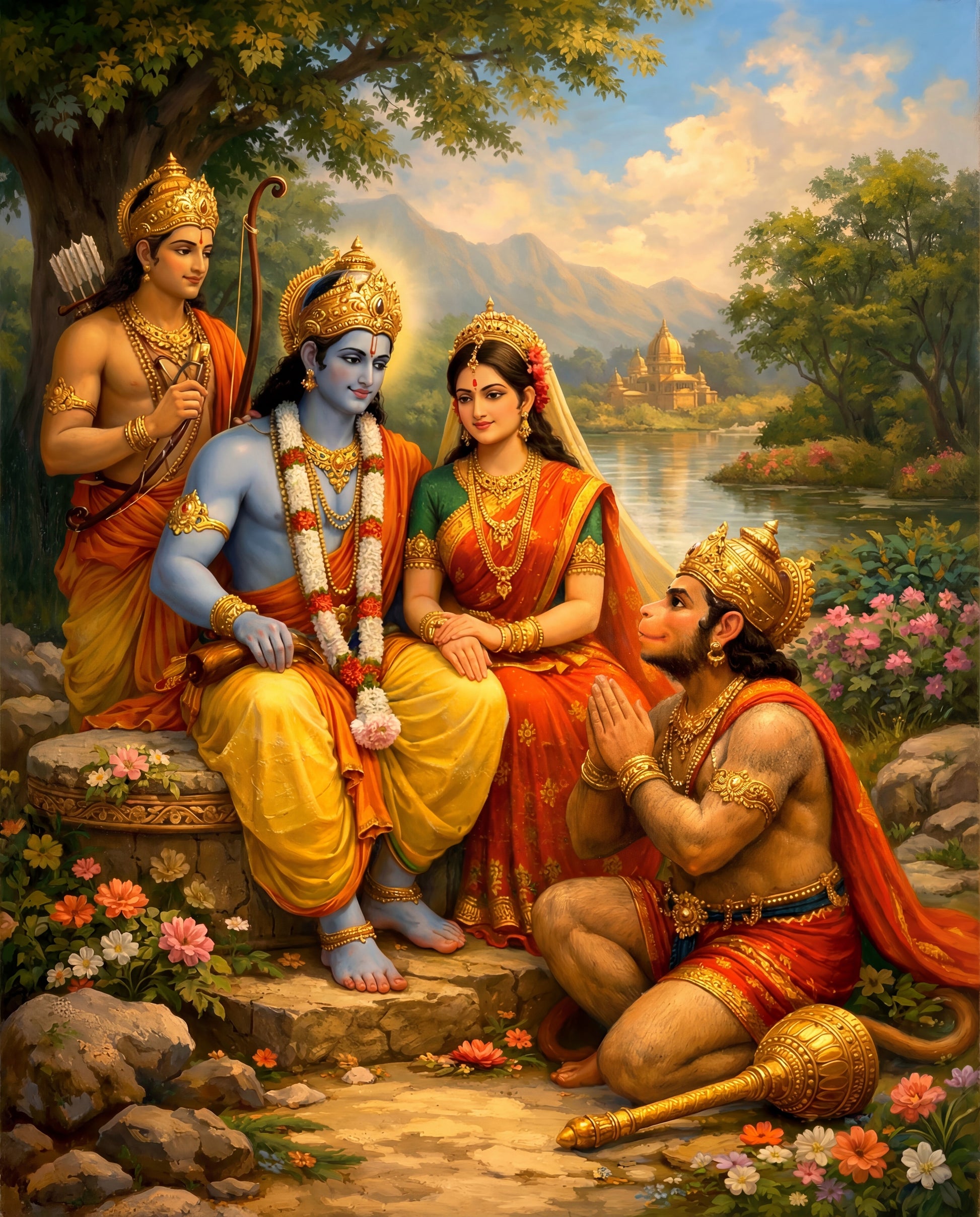 Rama and Sita sit together at the river's edge — unhurried, adorned, their garlands still fresh. Lakshmana stands a little apart, bow in hand, his vigilance unchanged even now. And Hanuman kneels before them, palms pressed together, eyes lifted. Not in supplication. In recognition.